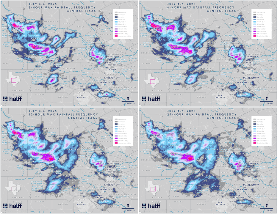 Halff’s internal precipitation tools compared observed rainfall against NOAA Atlas 14 return frequencies. The rainfall analysis showed highly variable patterns of intensity, depth and duration across the impacted region.