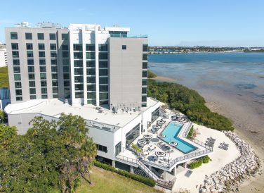 Wide aerial view of the Current Hotel next to the Tampa Bay